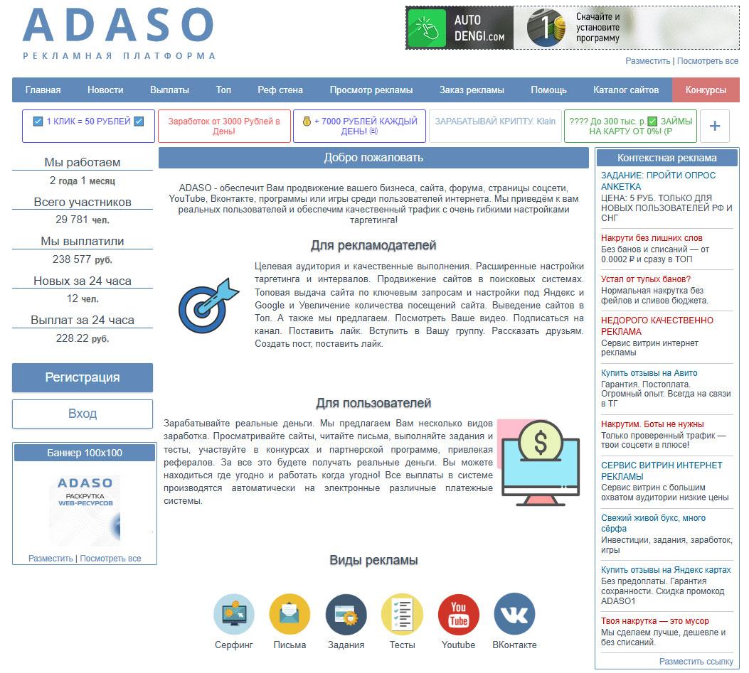 ADASO - обеспечит Вам продвижение вашего бизнеса, сайта, форума, страницы соцсети, YouTube, Вконтакте, программы или игры среди пользователей интернета. Мы приведём к вам реальных пользователей и обеспечим качественный трафик с очень гибкими настройками таргетинга!