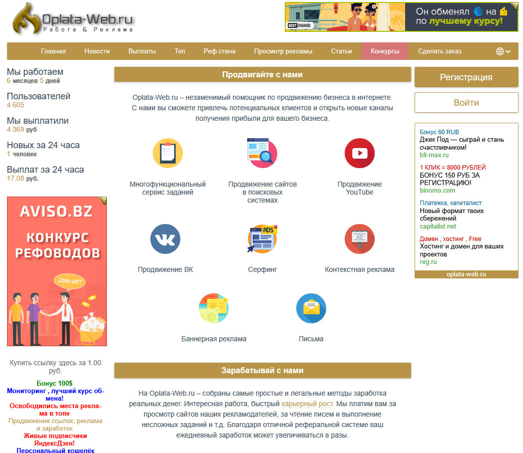 На Oplata-Web.ru – собраны самые простые и легальные методы заработка реальных денег. Интересная работа, быстрый карьерный рост. Мы платим вам за просмотр сайтов наших рекламодателей, за чтение писем и выполнение несложных заданий и т.д. Благодаря отличной реферальной системе ваш ежедневный заработок может увеличиваться в разы.
