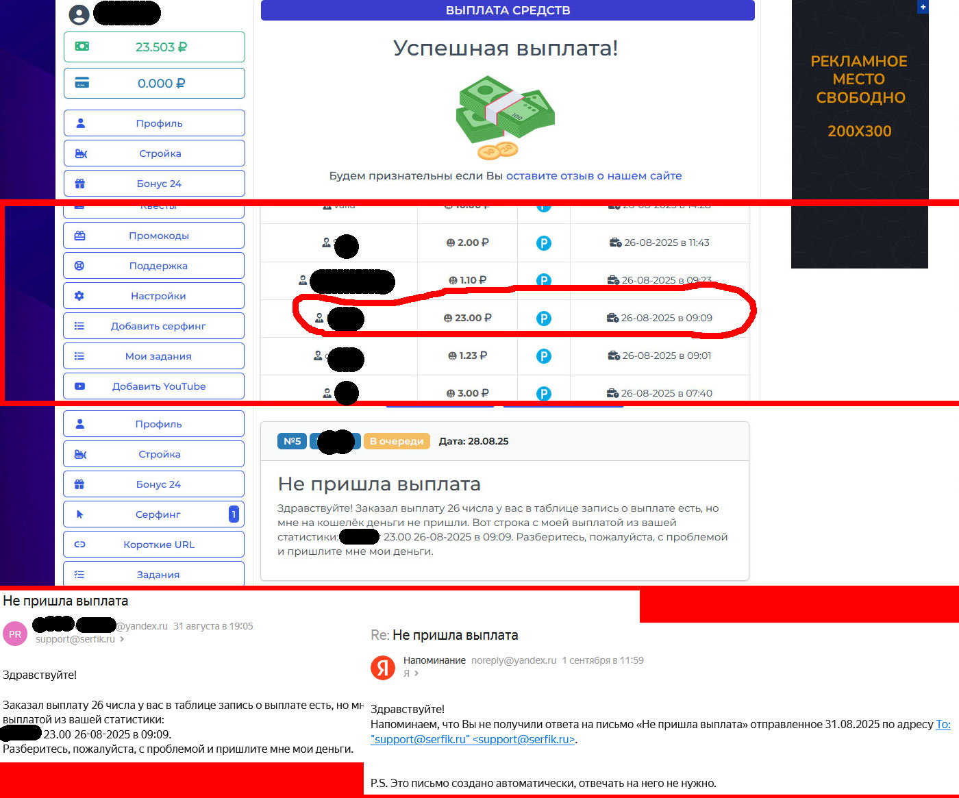Сайт не платит. Заработал 23 рубля, заказал выплату. Сайт написал, что выплата прошла, всё хорошо, вот только на кошелёк деньги так и не пришли. Я написал в техподдержку через сайт, немного подождал. Потом написал напрямую на email. Ответа не получил не по одному из вариантов. Всё это задокументировано на скриншоте.