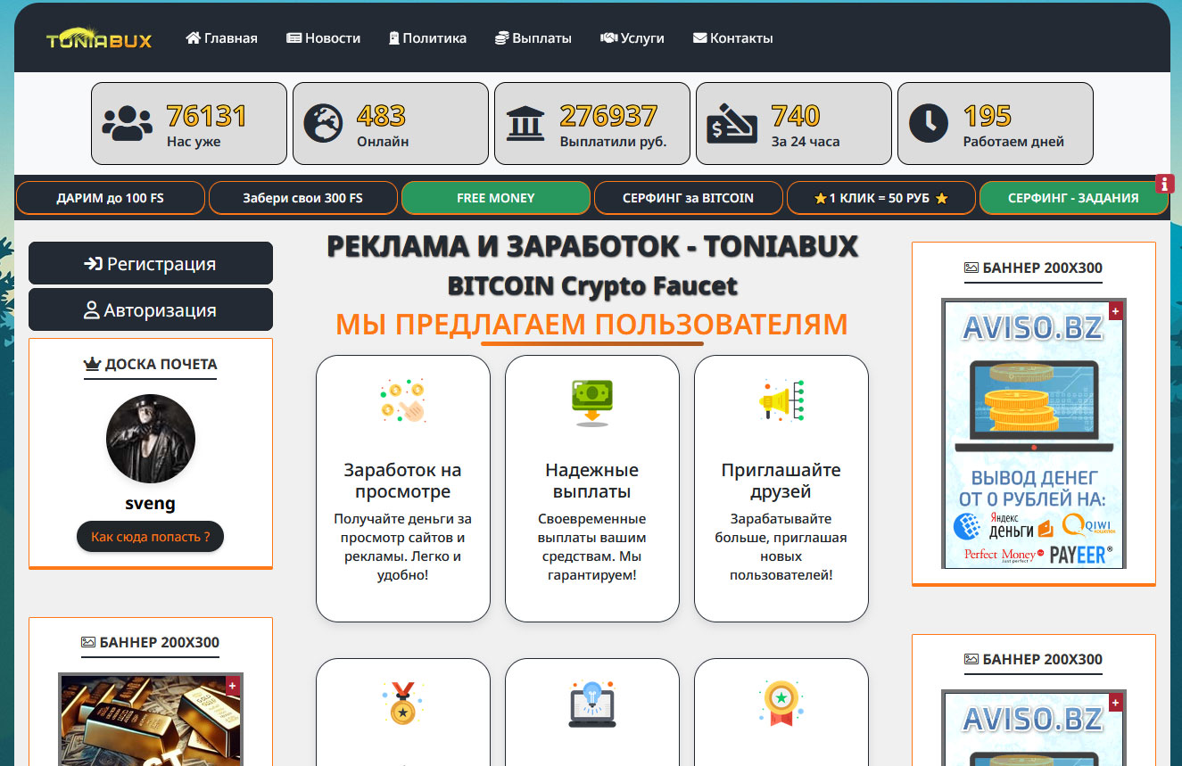 TONIABUX — это онлайн-платформа, предлагающая пользователям возможность зарабатывать на выполнении заданий, просмотре сайтов, а также продвигать свои проекты через рекламные услуги. Платформа подходит для тех, кто хочет повысить трафик на сайте или заработать без вложений.